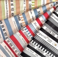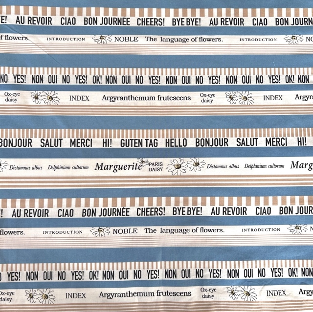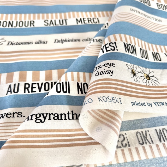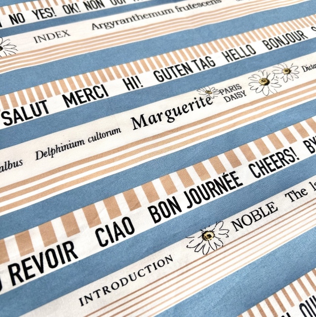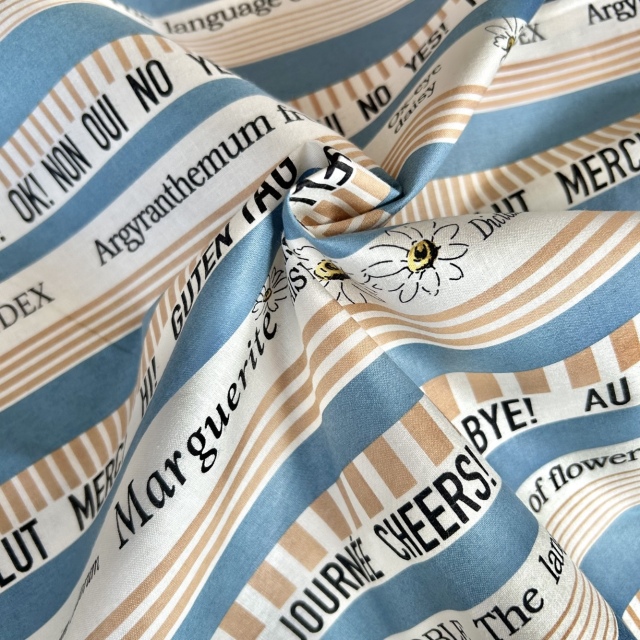 【小関鈴子先生デザインプリント】(JKS-385)ブルー・ベージュ ストライプ・英字柄