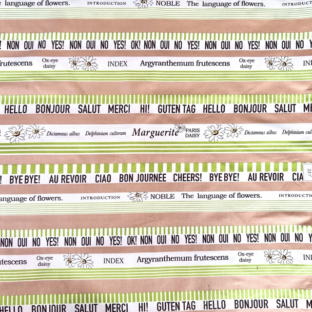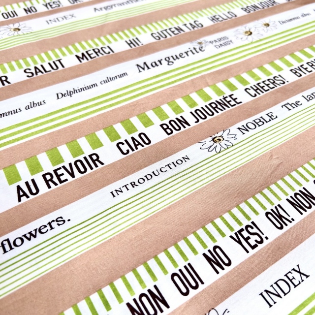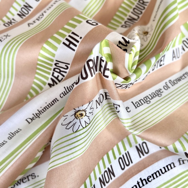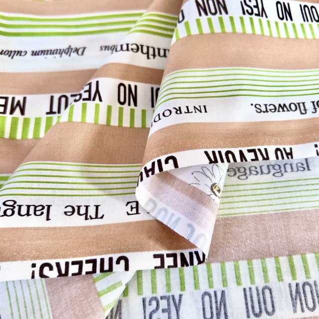 【小関鈴子先生デザインプリント】(JKS-381)グリーン・ベージュ ストライプ・英字柄