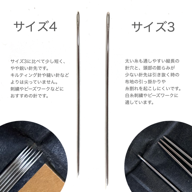 - 糸通しが容易な大きめ針穴と、先端が鋭く尖っていない【丸先針】が特徴です。