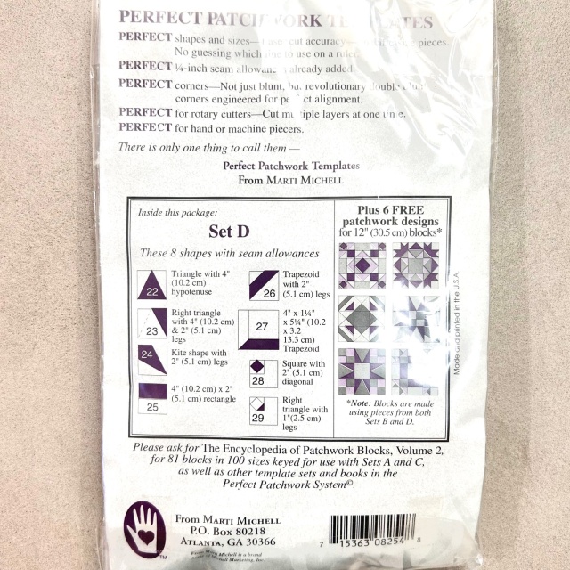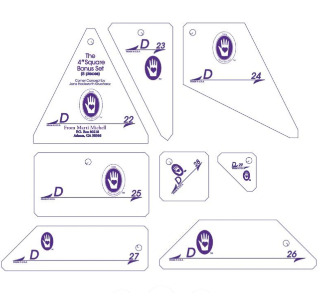 - マーティ・ミッチェルのパーフェクトテンプレート セットDには8枚の透明アクリルテンプレートが入っています。 セットDのテンプレートは、4インチ(10cm)をベースにしており、テンプレートセットBとセットでお使いいただけます。