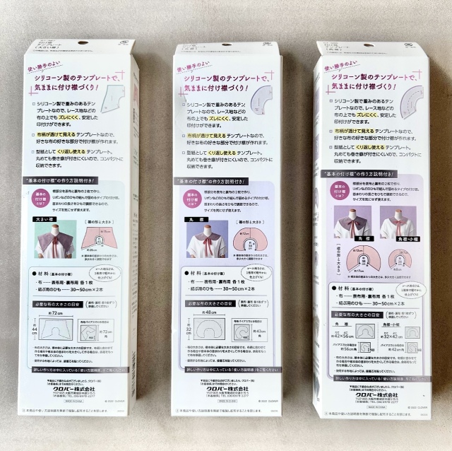 - 型紙として繰り返し使えるテンプレート。丸めても巻き癖が付きにくいのでコンパクトに収納できます。大きい襟、丸襟、角襟の3種類のデザインがございます。